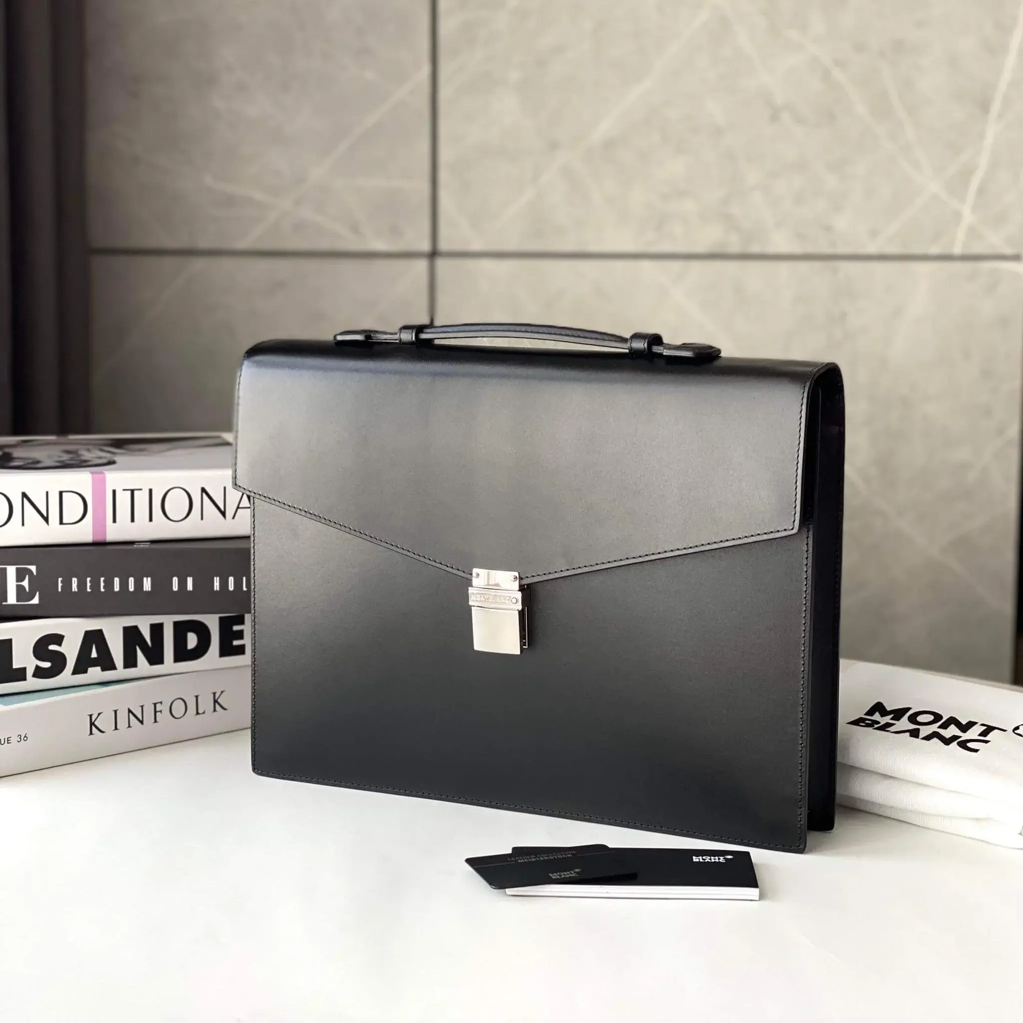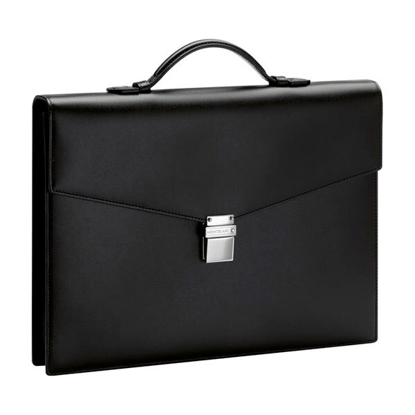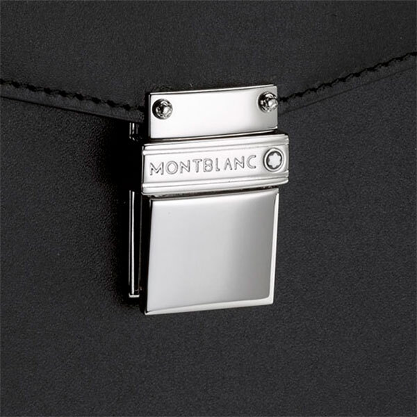 Портфель "Meisterstuck" на 1 отделение, изготовленный из черной зернистой южно-германской яловичной кожи, подкладка из черного жаккарда, фурнитура из полированной нержавеющей стали с платиновым покрытием.
